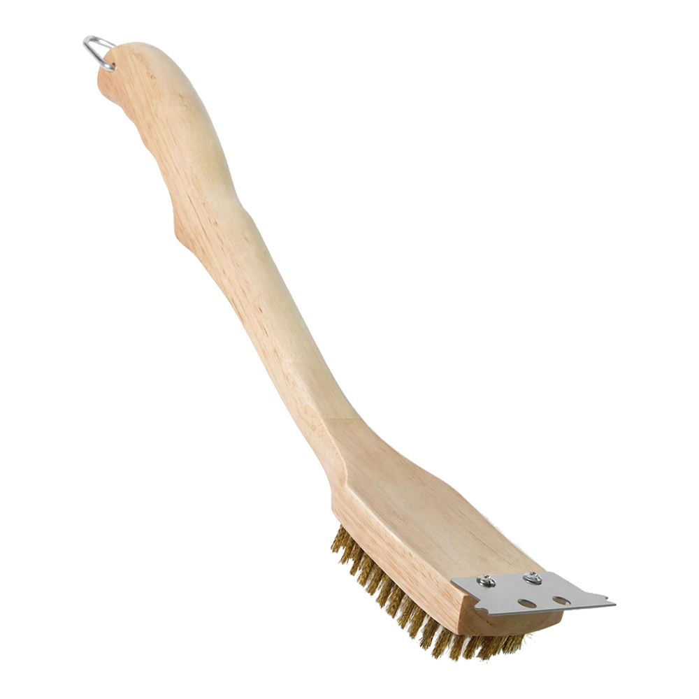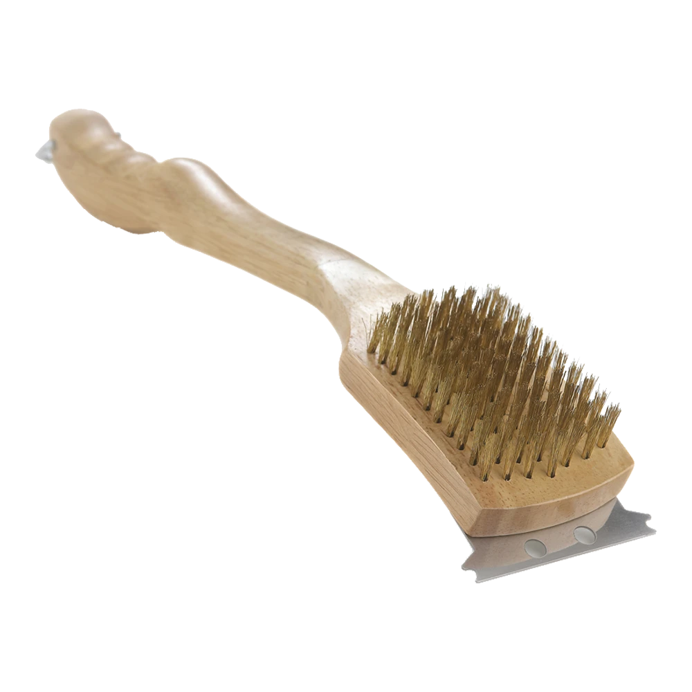 De ca. 45 cm lange barbecueborstel met koperen borstelharen houdt gietijzeren grillroosters schoon, met schraper en licht gekleurde houten steel