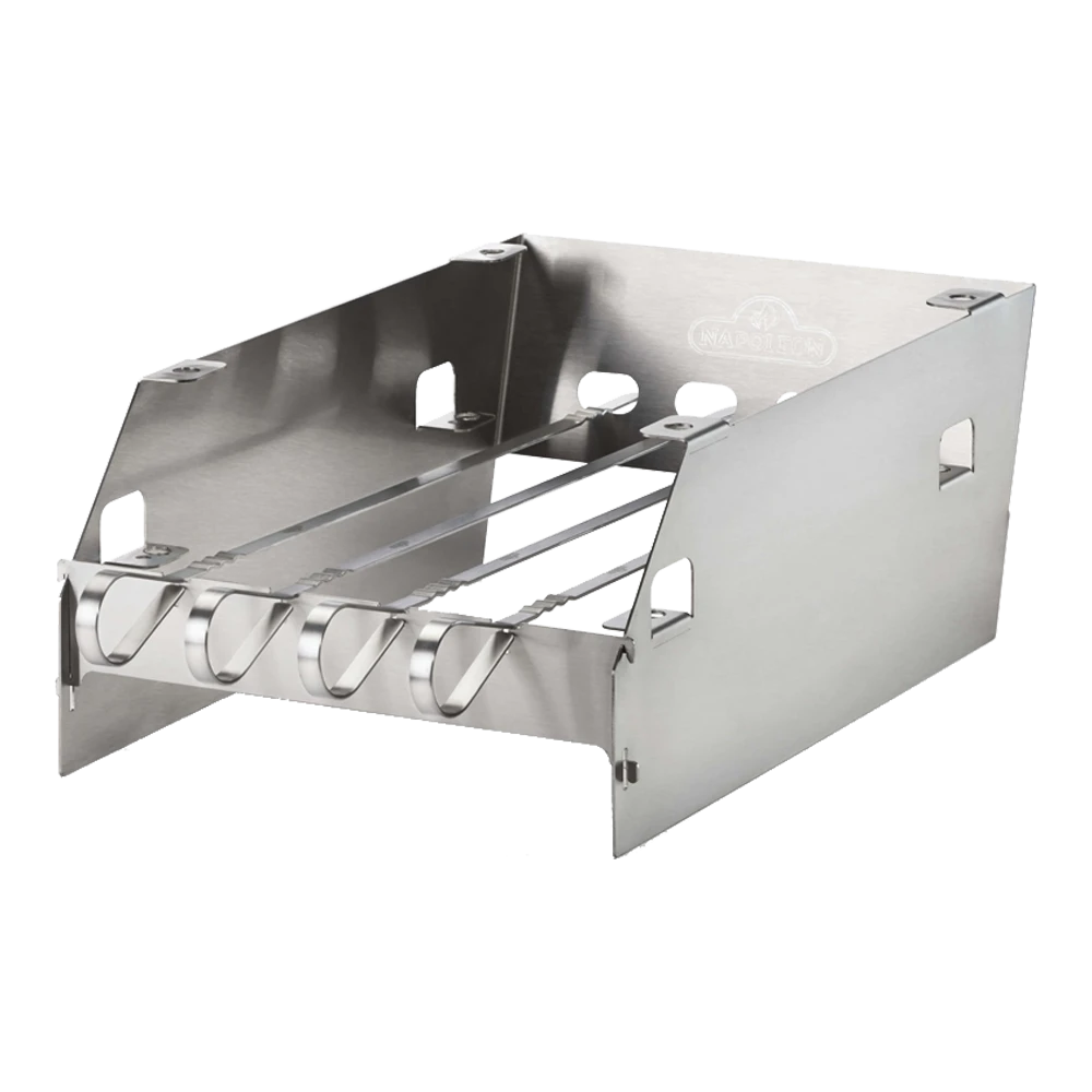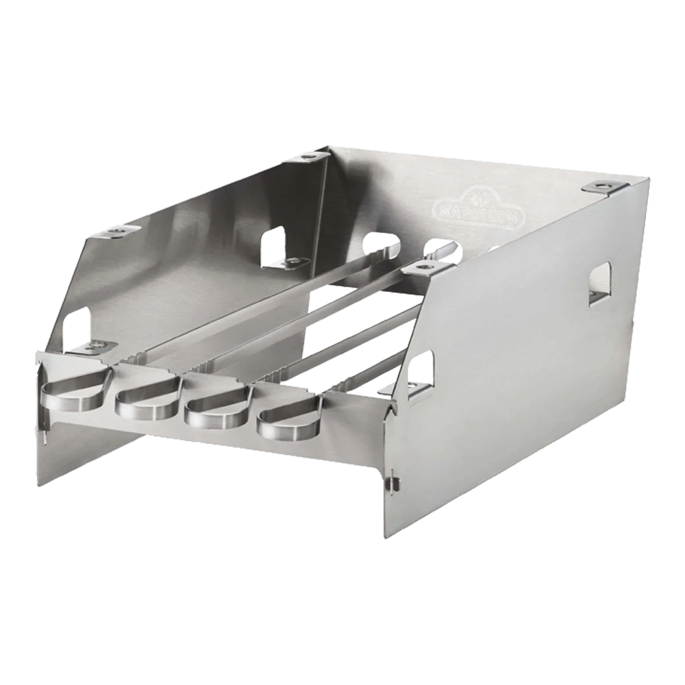 Multifunctioneel SIZZLE ZONE rek, te gebruiken als windscherm maar ook te gebruiken om het rooster op verschillende hoogtes in te stellen. Ontworpen met gleuven voor 6 shaschlik spiezen. Passend voor de RSE, Prestige en Prestige PRO modellen.