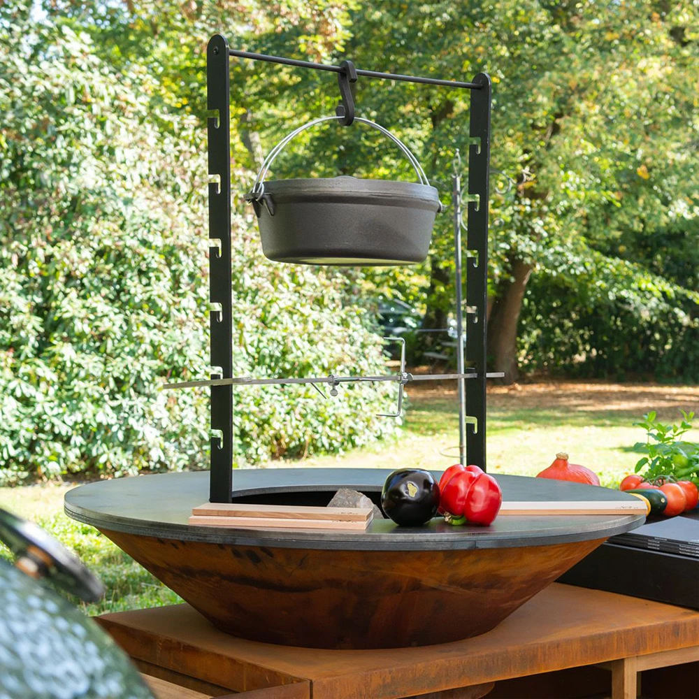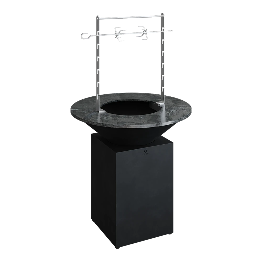 Wat is er mooier dan met een spit boven het vuur van het OFYR kooktoestel grote stukken vlees te bereiden of in een hangende pan heerlijk eten te koken? De Rotisserie Set is een must voor de echte barbecue fanaat. De Set bestaat uit 2 RVS staanders, die op ingenieuze wijze onder en op de kookplaat worden bevestigd, 1 RVS tussenbuis die de staanders bovenaan stevig verbindt, een spies met draaihaak met 2 grote en 2 kleine houders om ingrediënten vast te klemmen, en een S-haak om een pan aan op te hangen.