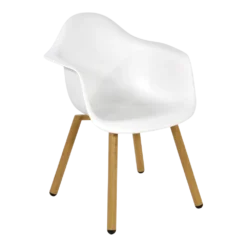 Het onderstel van de stoel heeft een houtlook, maar is vervaardigd uit aluminium. Hierdoor staat het niet alleen mooi, maar is de stoel ook onderhoudsvriendelijk! Het zitgedeelte is gemaakt van kunststof en bevat gaatjes voor de afvoer van (regen)water. Kunststof is sterk, onderhoudsarm en licht in gewicht. Beide materialen zijn zeer geschikt voor buiten.